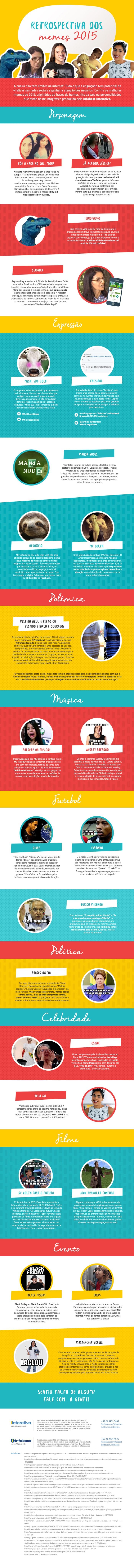 2015 não foi diferente. Tivemos o “Já acabou, Jéssica?”, o “Senhora? Senhora?” e um dos mais recentes que foi a “Carta do Temer”. O pessoal da IInterativa agrupou todos em um infográfico, separando em temas como política, eventos, filmes e celebridades, por exemplo.