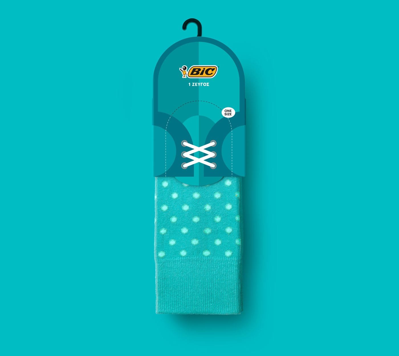 Na Grécia, por exemplo, a BIC também trabalha com um ramo diferente, que é o de meias. Isso mesmo, meias! E lá eles queriam modificar as embalagens para mostrar os diversos tipos e modelos de meias onde se destacassem no ponto de venda.